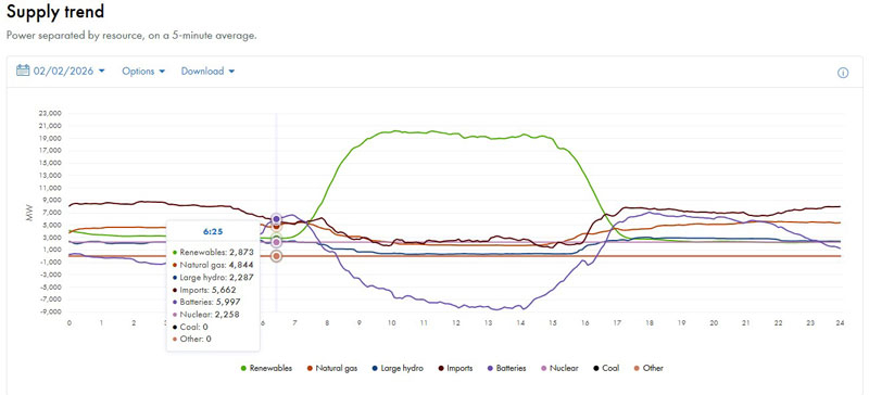 Постепенное совершенствование технологий работы сети от источников возобновляемой энергии обеспечило бесшовную координацию солнечных электростанций с накопительными установками: зарядка аккумуляторов происходила в светлое время суток от дешёвой избыточной генерации (примерно до 16:15), после чего они перешли в режим экспорта энергии, продолжая поставки даже после полуночи. Утром 2 февраля, с 06:25 до 08:20, батареи впервые в истории штата стали основным источником электроэнергии в сети примерно на час, а вечером они уже давно доминируют в пиковые часы — эта тенденция прослеживается с 2024 года.