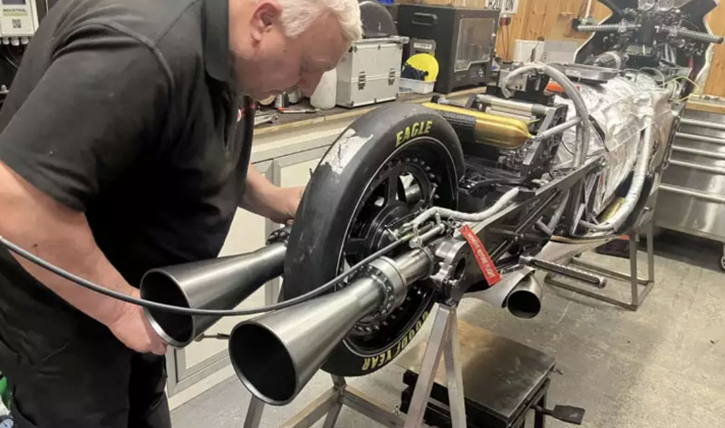 Удивительную машину построил 62-летний инженер-энтузиаст Грэм Сайкс (Graham Sykes) вместе со своей женой Дайаной в своей мастерской в Северном Йоркшире. Проект развивается уже около шести лет и сейчас находится на пятой стадии реализации. Новая версия байка получила удлинённое шасси, изменённую посадку, помогающую пилоту выдерживать стартовые перегрузки в 6 g, а также новые карбоновые щитки и переработанную систему нагрева с 44-кВт горелкой, которая быстрее выводит аппарат на рабочие температуры.