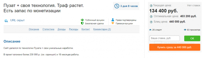 Минимальная цена — 134 400 рублей, оптимальная — 403 200 рублей. Что-то мне подсказывает, что ресурс продадут уже в ближайшем будущем. Сейчас сайт приносит 23 000 рублей в месяц.