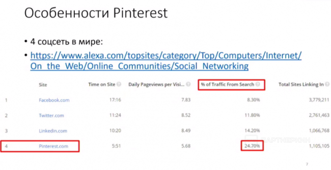 Четвертая в штатах по посещаемости площадка может стать отличным донором трафика. Pinterest получает 24,7% органического трафика от Google и из топовых социальных сетей. Это больше, чем у Fb и Twitter.