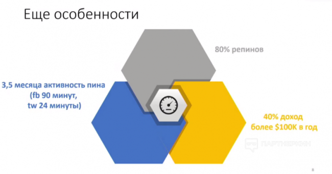 Одна из важных особенностей средняя активность пина — 3,5 месяца. Все это время одно сообщение может привлекать трафик. На Pinterest нет необходимости постоянно искать и создавать уникальные материалы. Нужно лишь вовремя репостить популярные картинки с других досок. С точки зрения целевой аудитории Pinterest выгоден — 40% зарегистрированных пользователей зарабатывают более $100k.
