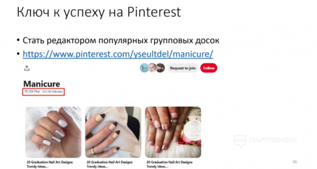 Ключ к успеху в этой социальной сети - стать редактором. Например, ищем авторов популярных досок, стучимся ему в личку и благодарим за крутой контент. Затем можно аккуратно попроситься в помощники и время от времени ставить свои ссылки на популярных пинах.