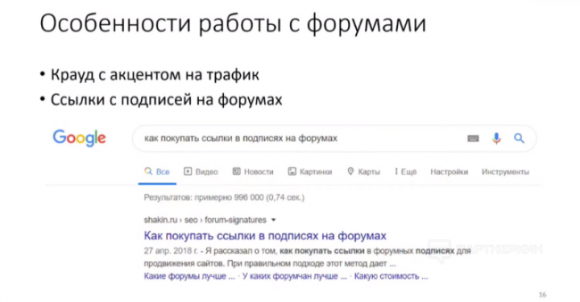 В работе с форумами следует делать ставку на крауд с акцентом на трафик и ссылки с подписей и комментариев.