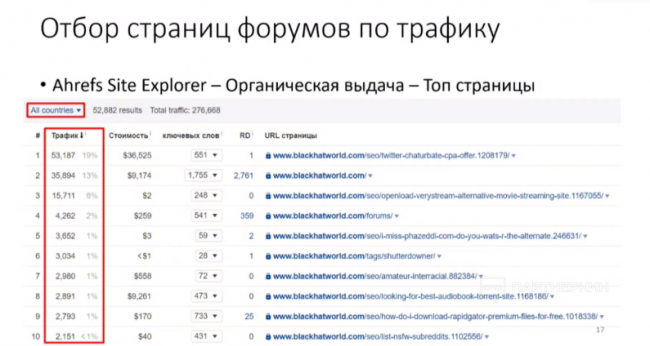 Выбираем самые жирные страницы по трафику. Идем в Ahrefs — органическая выдача, ищем в пункте топ страницы самые трафиковые в нашей тематике. Купить подпись можно у топик-стартера (человека, который создал тему) или у любого участника обсуждения на первой странице. Ставим на каждую ссылку UTM-метки и смотрим какие лучше работают. Оптимальное сочетание по стоимости ссылки и количеству приводимого ею трафика: $10 к 200-300 посетителей.