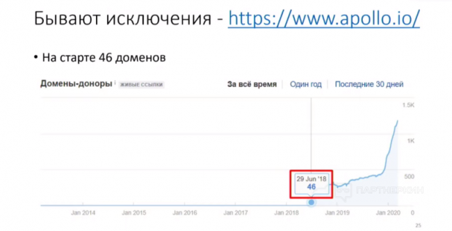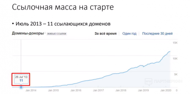 График ссылочного роста идеален. Смотрим, когда примерно на сайт пошел трафик и начали появляться домены-доноры.