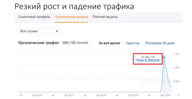 Казалось бы все круто. Но если посмотреть на график посещаемости, можно увидеть резкий скачок посещаемости и ее стремительное падение. Ни о чем хорошем это не говорит. Такую площадку не стоит использовать в качестве ориентира.
