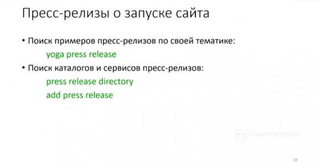 Молодым сайтам обязательно нужна прививка трастом. Хорошим примером будут пресс-релизы о запуске нового сайта. Смотрим примеры и ориентируемся на них: свой запрос и тематику+ press release. Также ищем каталоги пресс-релизов, в которых можно размещаться.