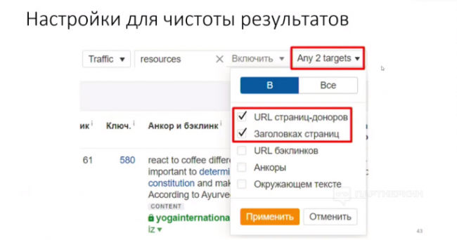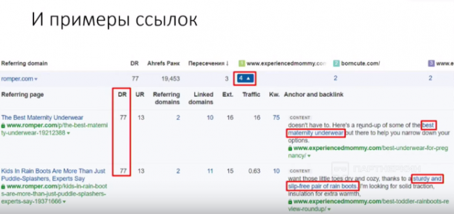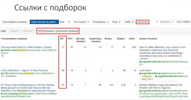 Если проанализировать площадку по слову resource, то можно увидеть, что 165 ссылок получено с сайтов-подборок.