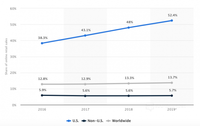 Еще в 2016 году доля рынка Amazon в американском eCommerce составляла всего 38%, а в 2018 году она выросла до 48%. В 2019 году платформа уже заняла более половины рынка онлайн-продаж. Параллельно с ростом доли рынка, падала зависимость Amazon от партнеров, которые ранее обеспечивали львиную долю трафика. Так, если в 2012-13 годах трафик от аффилиатов составлял 40% от общего объема, то в сейчас он едва превышает 6%.