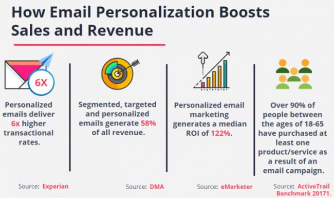 (персонализация увеличивает количество доставляемой почты; таргетированные email’ы делают 58% всего дохода, обеспечивают рост ROI на 122%; более 90% людей 18-65лет покупали хотя бы 1 продукт/сервис в результате комплексной рекламной email-кампании)