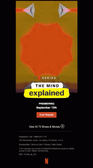 Netflix удачно совмещает все тренды дизайна рассылок — интерактивную GIF графику, краткие текстовые блоки, не слишком жирные шрифты, максимально простые фразы и кнопку-ссылку на трейлер. В этом примере есть вся необходимая информация по сериалу, компания не «заморачивается» насчет лишних подробностей, таких, например, как краткий анонс сериала, поскольку в любом случае он будет упомянут в трейлере.