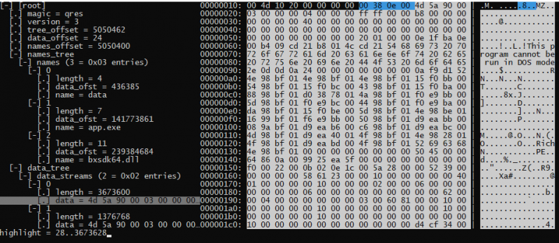 Если же все в порядке, flock.exe расшифровывает данные из файла data.pak с помощью алгоритма AES-128-CTR, причем ключ для расшифровки и вектор инициализации собираются из нескольких частей, хранящихся в коде образца. После расшифровки получается файл бинарных ресурсов Qt, в котором находятся два исполняемых файла — опенсорсный майнер XMRig (такой же использовался и в летней атаке) и библиотека bxsdk64.dll. Файл bxsdk64.dll в данном случае используется для запуска майнера под видом легитимного приложения find.exe.