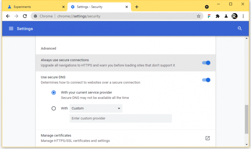 Чтобы протестировать экспериментальную функцию прямо сейчас, нужно активировать флаг «HTTPS-Only Mode Setting», в настройках: chrome://flags/#https-only-mode-setting. Это добавит новый параметр «Always use secure connections» в настройки безопасности браузера.