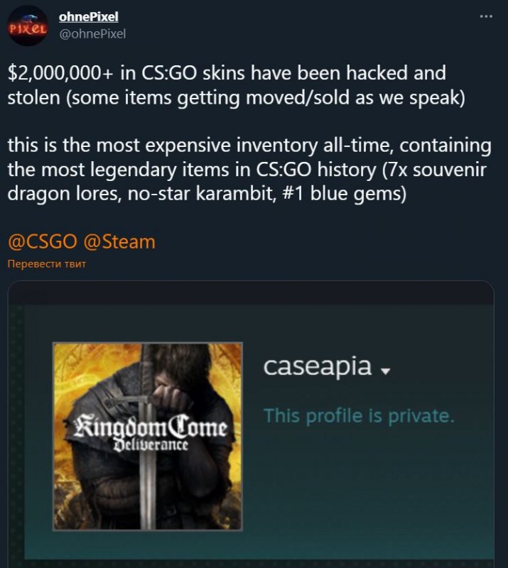Стример ohnePixel рассказал о громкой краже, произошедшей ранее на этой неделе. Хакер похитил у игрока Counter-Strike: Global Offensive редкие предметы, а общая стоимость инвентаря пострадавшего оценивается примерно в 2 млн долларов США.