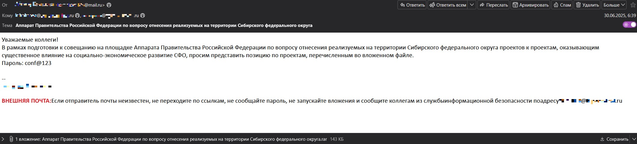 Атака началась с классической фишинговой рассылки. Злоумышленники рассылали письма якобы от имени государственных структур с использованием скомпрометированных email-адресов. Такие послания содержали архивы, защищенные паролем, внутри которых находился ранее неизвестный бэкдор BackDoor.ShellNET.1 (основанный на опенсорсном Reverse-Shell-CS), замаскированный под документы с названиями вроде «Служебная записка от 16.06.2025» или «О проведении личного приема граждан список участников».