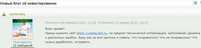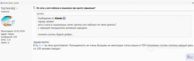 Тут пользователь заинтересовался темой криптовалют, и попросил посоветовать ему какие-нибудь ресурсы. Я вставил ссылку на свой блог и несколько человек с этого форума заходит каждый день.