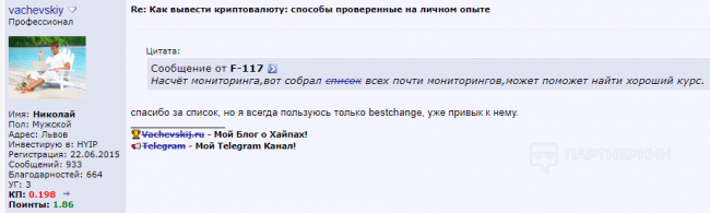 Но прежде чем размещать какую-нибудь рекламу, нужно прокачать свой аккаунт. Сделать это очень просто, достаточно оставить 20-30 полезных сообщений (главное не флудить). Для большего доверия можно еще заполнить профиль и загрузить фото. Так вы уже будете полноценным участником, и у вас будет намного больше шансов, что ваши сообщения со ссылкой модераторы не удалят. Вот несколько примеров: