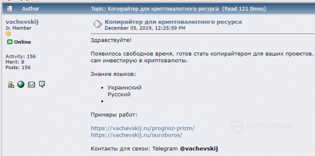 На популярном форуме я создал тему, что готов стать копирайтером для крипто ресурса. Во-первых, мне пишут клиенты, которым нужны статьи для сайтов, а во-вторых - я оставил сразу 2 ссылки на свой блог: