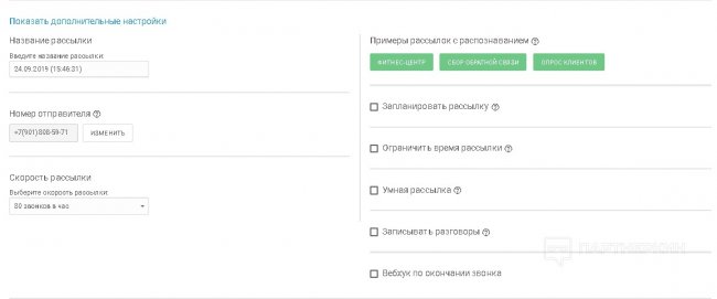 В дополнительных настройках вы можете изменить номер отправителя, добавить личный номер в случае необходимости, отрегулировать скорость рассылки, запланировать ее на определенное время, а также ограничить время ее проведения. Например, это понадобится, если ваш сценарий подразумевает переадресацию на менеджера, чтобы не перегружать его входящими звонками.