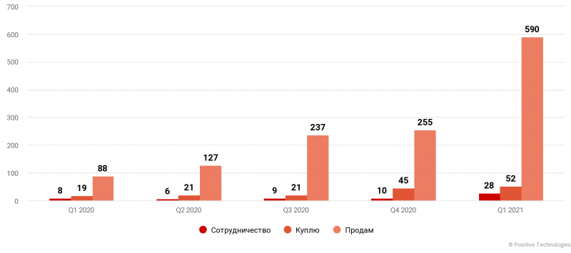 Исследователи отмечают, что количество таких объявлений в даркнете увеличивалось с каждым кварталом на протяжении всего рассматриваемого периода. К примеру, только в первом квартале 2021 года было обнаружено 590 новых объявлений, а это 83% от числа всех предложений в 2020 году. И по сравнению с первым кварталом 2020 года в первом квартале 2021 года количество пользователей, размещающих объявления о продаже/покупке доступов, а также о поисках напарников увеличилось в три раза.