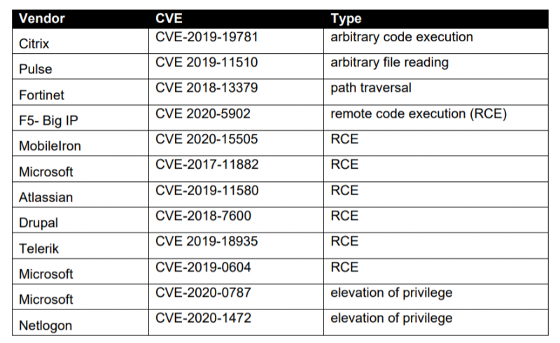 На основе данных, собранных правительством США, большая часть самых атакуемых уязвимостей была обнаружена после начала 2020 года, и многие баги явно связаны с повсеместным переходом на удаленную работу. В итоге четыре уязвимости, чаще всего использованные в 2020 году, были связаны с удаленной работой, VPN и облачными сервисами.