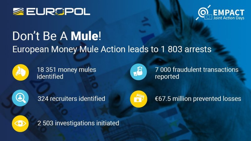 Представители Европола сообщают об аресте 1803 денежных мулов, а также о выявлении 18 351 лиц, занимающихся подобной деятельностью, в результате международной операции по борьбе с отмыванием денег EMMA 7. Как можно понять по названию, это не первая операция такого рода, первая EMMA была проведена еще в 2016 году.