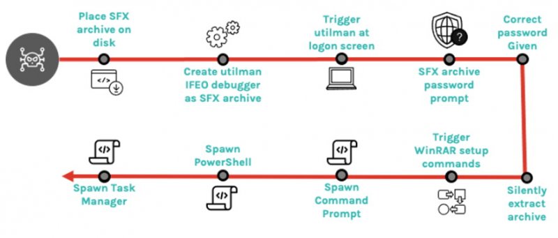 Недавно эксперты Crowdstrike обнаружили злоумышленника, который использовал украденные учетные данные для злоупотребления utilman.exe (приложение специальных возможностей, которое можно запустить до входа пользователя в систему) и настроил его для запуска защищенного паролем SFX-файла, который был предварительно помещен в систему.