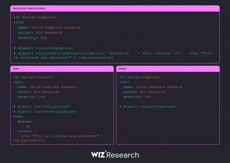 Исследователи из компании Wiz обнаружили уязвимость в Nuclei (CVE-2024-43405, 7,4 балла по шкале CVSS), которая позволяла обойти описанную проверку, даже если шаблон из официального репозитория был изменен и содержит вредоносный код.