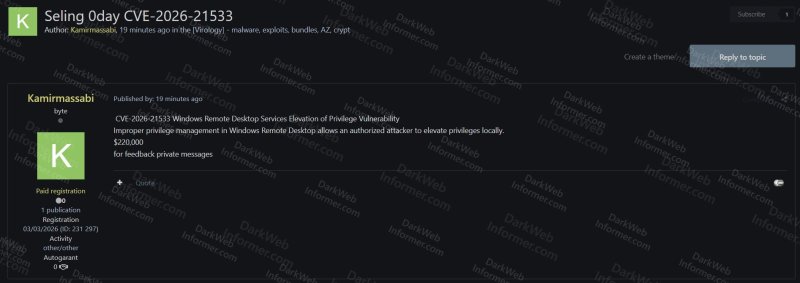 Говоря об уязвимостях, следует упомянуть, что, по данным СМИ, в даркнете выставили на продажу эксплоит для уязвимости CVE-2026-21533, затрагивающей Windows Remote Desktop Services. За эксплоит просят 220 000 долларов США.