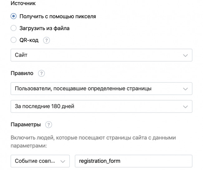 <script> VK.Retargeting.Event("registration_form") </script>Перейдите в раздел «Ретаргетинг» и создайте аудиторию по пикселю. В параметрах выберите «событие совпадает» и введите: «registration_form».