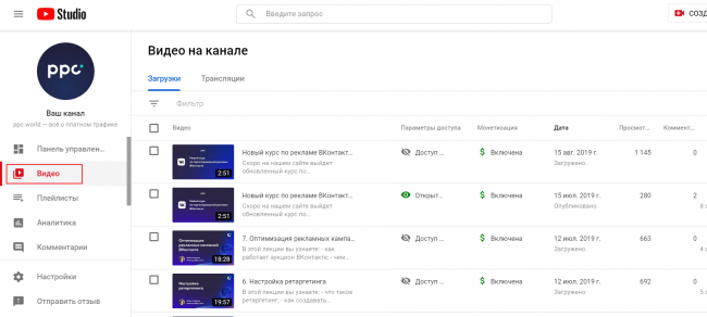 Чтобы настроить обложку, зайдите в свой канал на YouTube. Перейдите в Творческую студию и выберите раздел «Видео».