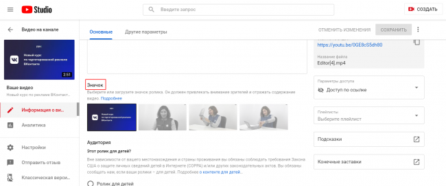 Кликните по нужному видео. В разделе «Значок» система предложит вам несколько вариантов. Выберите из предложенных или загрузите свою обложку.