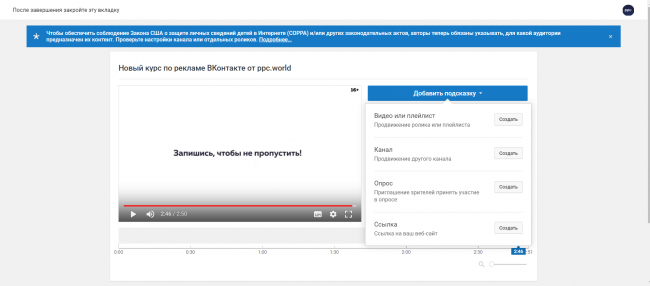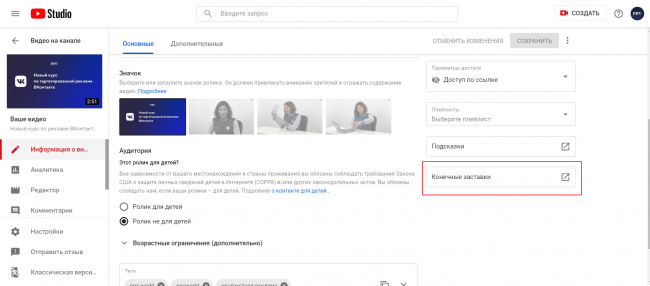 Конечная заставка добавляется в режиме редактирования видео в Творческой студии, там же, где настраиваются подсказки и обложка.