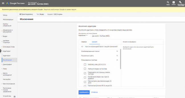 Если кампания длится уже некоторое время и вы заинтересованы в том, чтобы привлекать только новых пользователей, исключите людей, которые уже смотрели видео и взаимодействовали с ним.