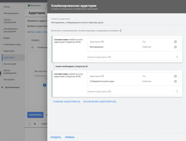 Если вы захотите создать аудиторию молодых семей, которые собираются приобрести недвижимость, то вам придется изрядно помучиться, чтобы соединить аудиторию молодых семей и интересы в категориях ипотеки или недвижимости. Возможно, вы пойдете по пути «Особой аудитории по намерениям», но это вряд ли даст такой же результат, как комбинированные аудитории.