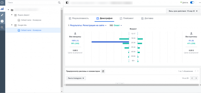 Демография. Здесь собраны результаты рекламы с разбивкой по возрасту и полу. С их помощью можно выяснить, кто лучше реагирует на объявления, чтобы в дальнейшем оптимизировать рекламу: уточнить таргетинги, создать более релевантное предложение в зависимости от особенностей ЦА и т. д.