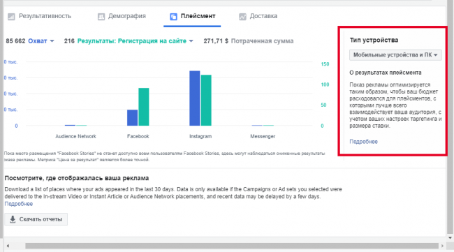Плейсмент. На этой вкладке — эффективность объявления на разных плейсментах. Благодаря этой информации можно определить, где эффективнее всего показывать рекламу. Если одно и то же объявление хорошо отрабатывает в Facebook, а показатели в Instagram плохие, стоит попробовать создать отдельные объявления для каждого плейсмента с учетом его особенностей.