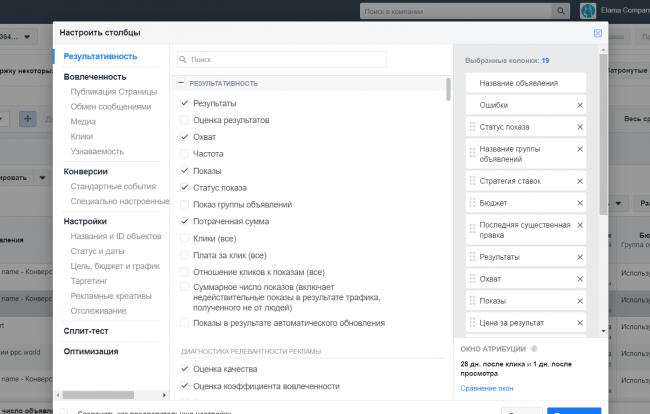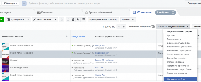 Чтобы увидеть больше метрик в таблице с кампаниями группами и объявлениями, кликните по раскрывающемуся меню «Столбцы». Нажмите «Настроить столбцы», чтобы добавить больше показателей в таблицу. Здесь же можно удалить лишние показатели, нажав на крестик справа от параметра.