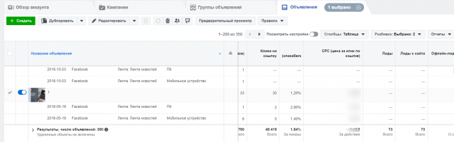 Там же можно посмотреть эффективность рекламы на разных устройствах, по умолчанию показываются данные на мобильных устройствах и на ПК.