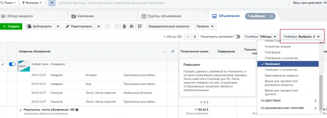 Также можно сделать разбивку по времени, плейсменту, устройствам и т. д., кликнув по раскрывающемуся меню «Разбивка».