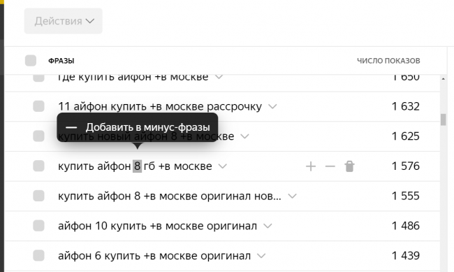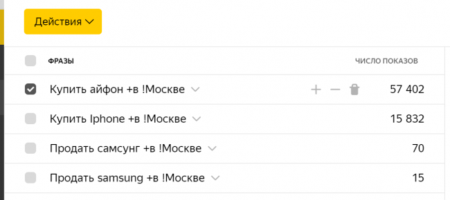 Кнопка «Действия» станет активна, как только мы выберем (поставим галочку) одно или несколько ключевых слов. Под этой кнопкой скрываются две опции: добавить выбранные ключевые фразы либо удалить их.
