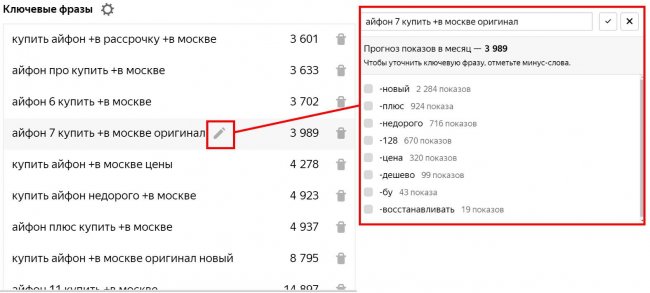 Мы собрали все необходимые нам слова в блоке «Ключевые фразы». Как еще улучшить качество собранных фраз? Для этого у нас есть возможность дополнительно уточнить каждую ключевую фразу, добавив минус-слова исключительно для этой нее.