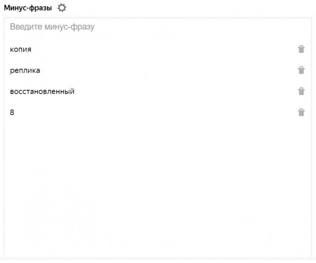 Последний блок — минус-фразы. Здесь собираются как фразы, так и слова, которые мы убирали, работая в блоке статистики и вложенных запросов. Просмотрите список еще раз. Если у вас есть дополнительные минус-фразы, которые нужно добавить, то это можно сделать вручную: просто нажмите на поле ввода, которое находится чуть выше первой минус-фразы, впишите необходимое и нажмите Enter. Если вы внесли минус-фразу по ошибке, то убрать ее из списка можно, нажав иконку корзины справа от фразы.