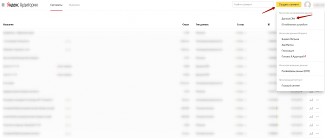 Кликните на кнопку «Создать сегмент» и выберите «Данные CRM».