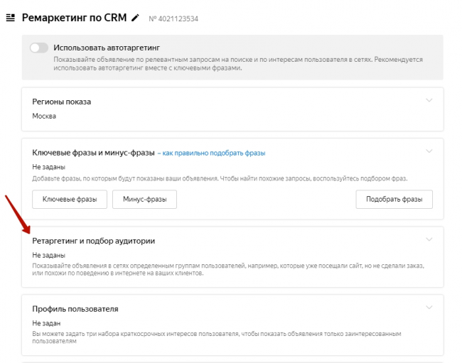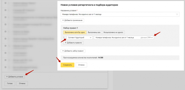 В разделе «Ретаргетинг и подбор аудитории» нажмите «Добавить условие» и заполните название условия.