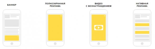 - Баннер. В AdSense показывается показа вверху и внизу экрана, а в РСЯ встраивается в контент приложения или открывается поверх него.