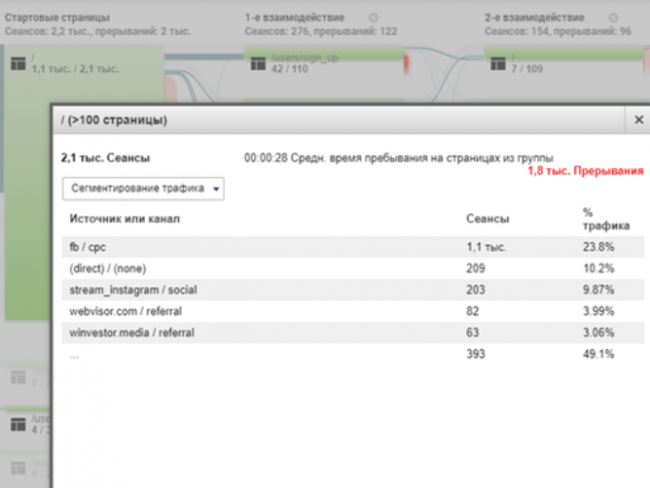 Чем больше доля проходящего трафика, тем лучше. Прерывания — это своего рода показатель выходов. На данном этапе этот показатель позволяет выявить потенциально проблемные страницы.
