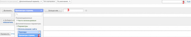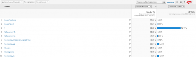 Поэтому лучше сравнивать поведение на страницах с примерно одинаковой посещаемостью. Для этого задаем фильтры. В Google Analytics фильтр доступен прямо в отчете, чтобы им воспользоваться, выберите показатель «Просмотры страниц» и задайте число исходя из посещаемости сайта.