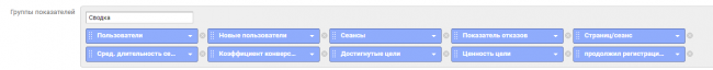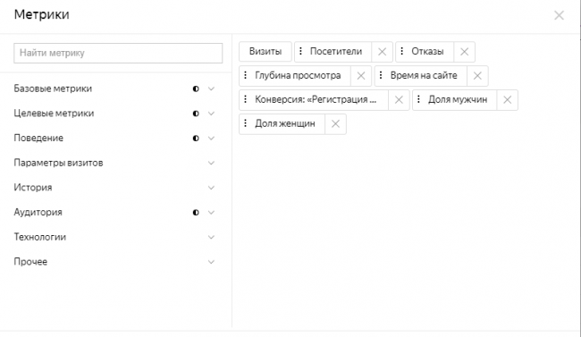 Метрики — это показатели, которые нас интересуют и которые тоже можно выбрать самостоятельно. Здесь есть базовые (поведенческие факторы — время на сайте, отказы, глубина и т. д.), целевые (показатели конверсии), а также метрики с информацией о демографии и используемых устройствах.