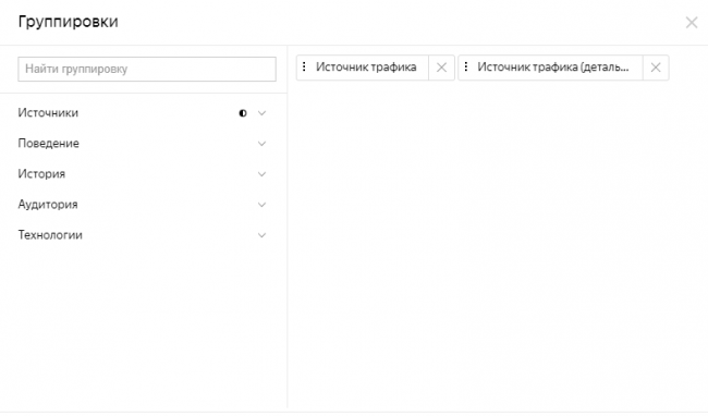 Группировки — это последовательность отображения показателей. По умолчанию это «Источник трафика» и «Источник трафика (детально)». Например, «Переходы по рекламе» — «Facebook». Вместо этих показателей можете выбрать свои.